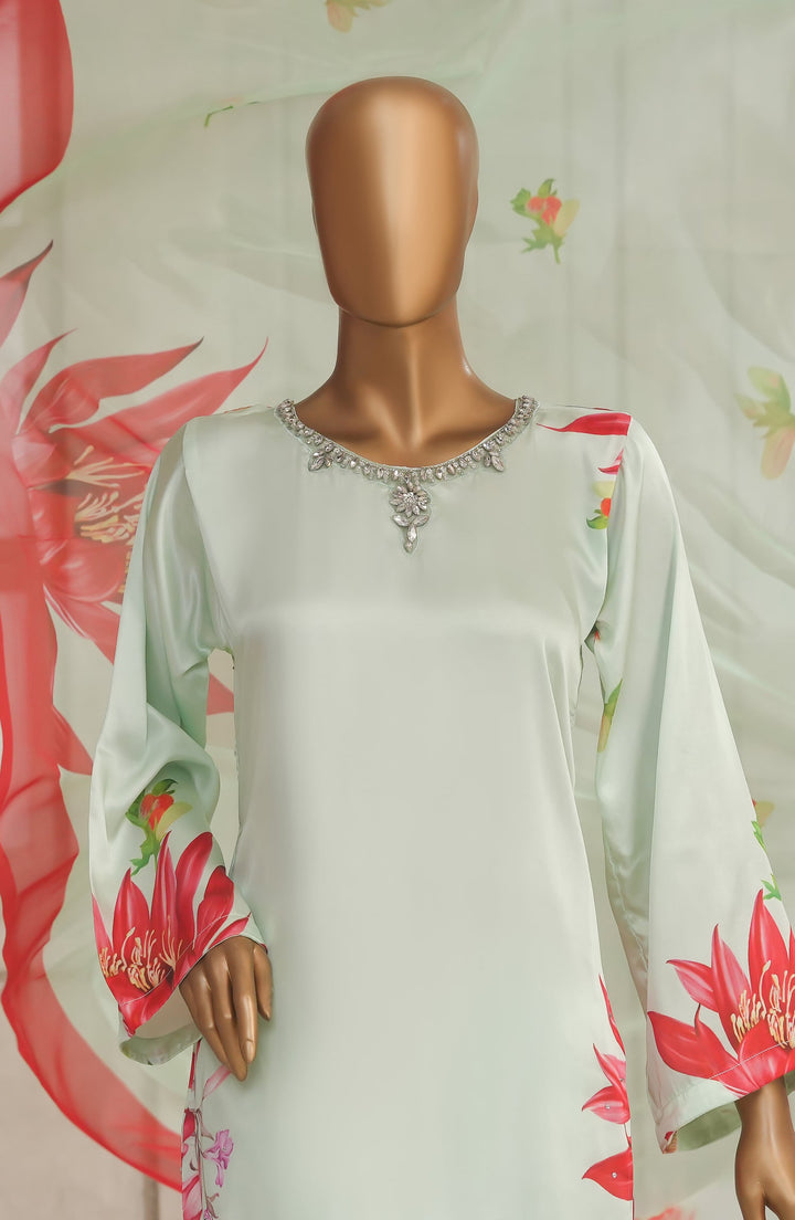 Digital Printed Stitch Poly Charmeous Silk Shirt with Hand Embellished Neckline