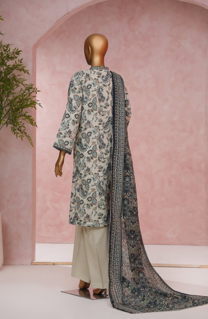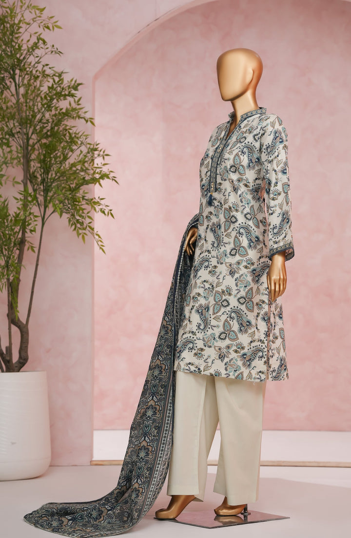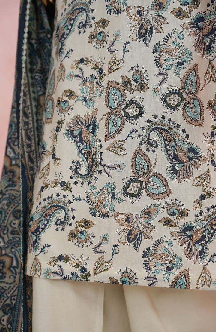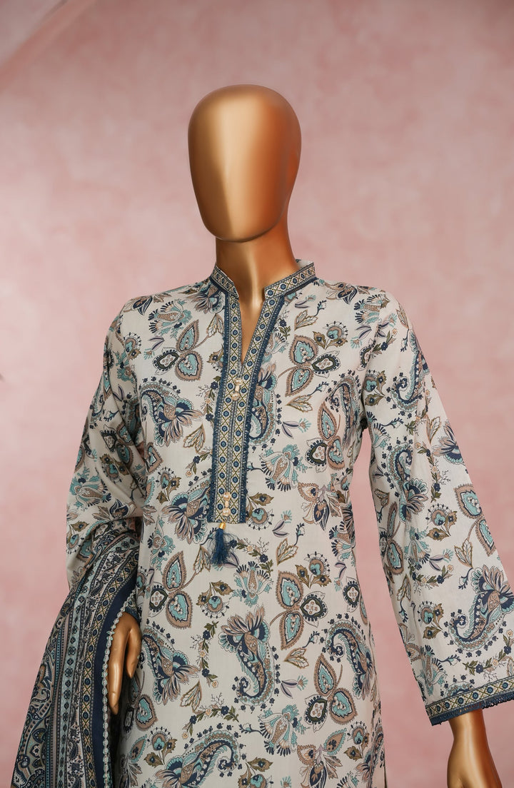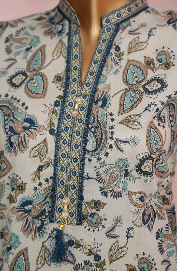Stitched Digital Print Cotton Cambric 3-piece suit with embellishments with Digital Print and Qureshia dupatta and tailored trouser.
