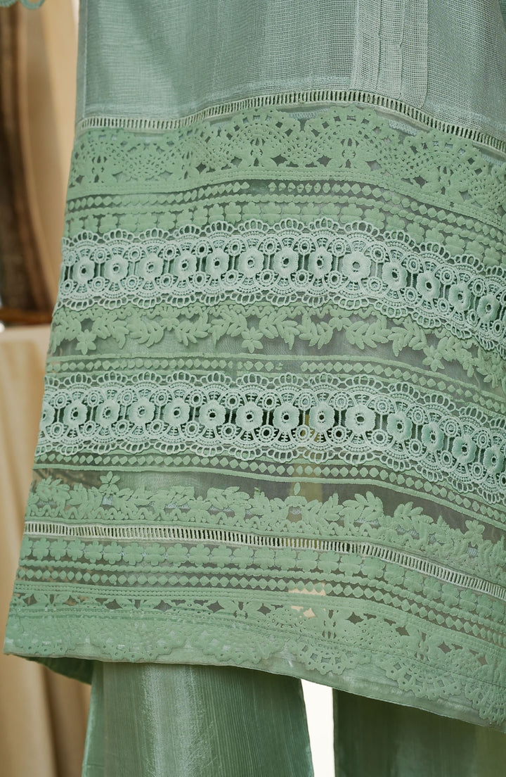 Exclusive Handwork Embroidered Stitched Khaddi Net Shirt with Lacework & Embellishments including Raw Silk Inner