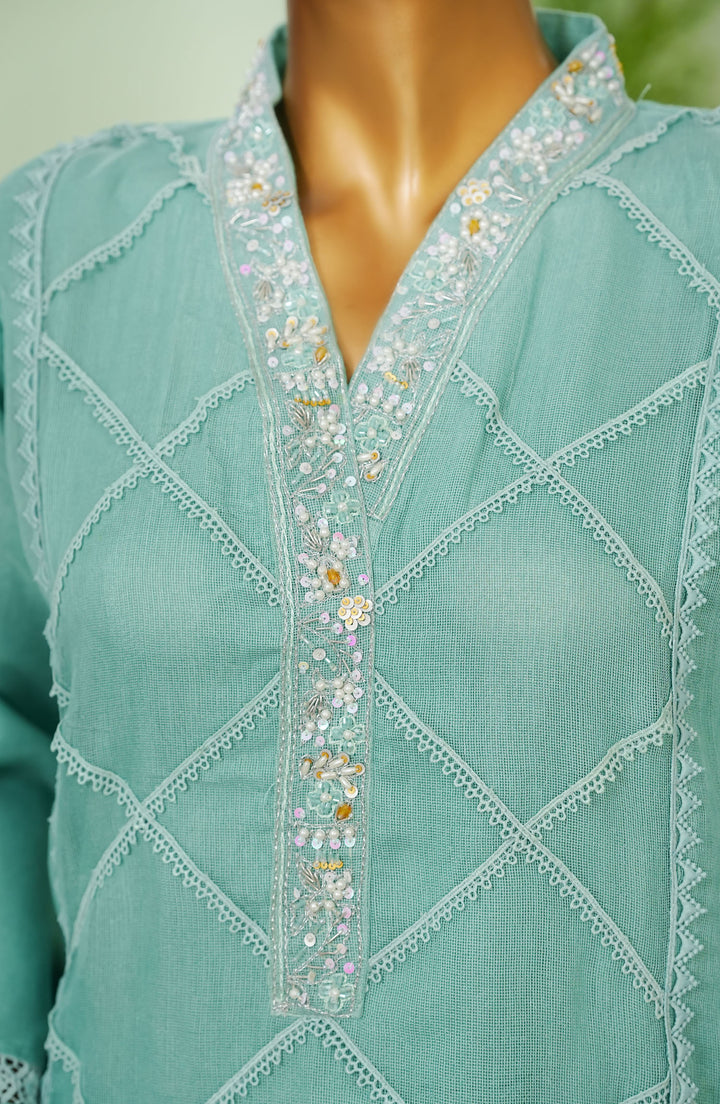 Exclusive Handwork Embroidered Stitched Khaddi Net Shirt with Lacework and Raw Silk Inner