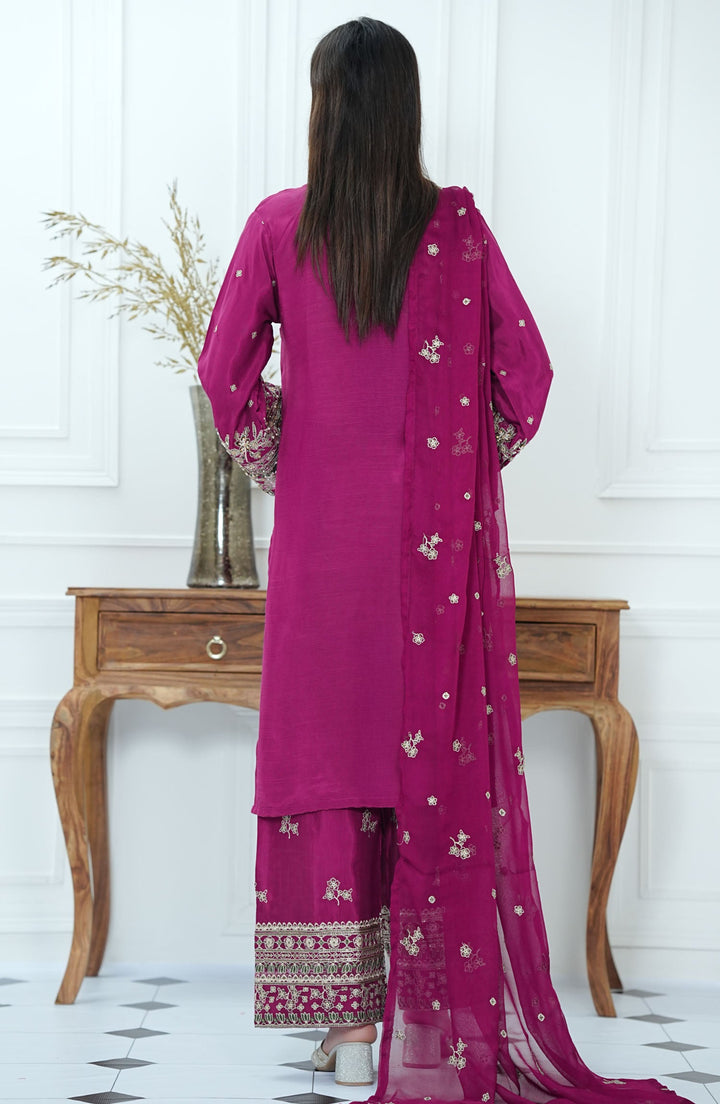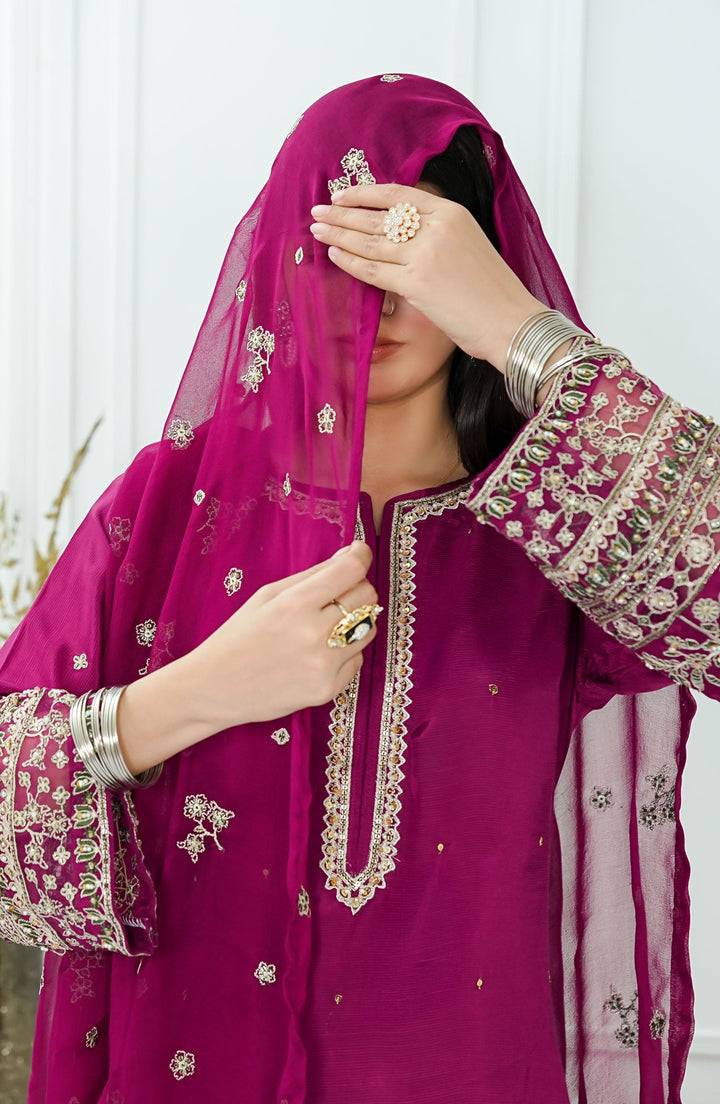 Zareen by Amna Khadija Embroidered Raw Silk Stitched 3 Piece Suit - ZLF-04 - AM25ZLF - Magenta - Festive Collection